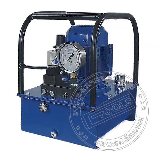 Гидростанция для пресса / Маслостанция ручная 700 бар – ГНС-08Р2Э8. Гидравлический насос с электроприводом обеспечивает подача в две ступени гидравлической жидкости с высокой скоростью без нагрузки до 5.0 л/мин для прохождения холостого хода рабочего инструмента. Непосредственно рабочий цикл происходит при подаче 0.9 л/мин, что для основной массы электромонтажного гидравлического инструмента с рабочим объёмом не более 150 см3 является достаточным по скорости для выполнения операций по резке кабеля, опрессовке кабельных наконечников и пробивке отверстий в металле.