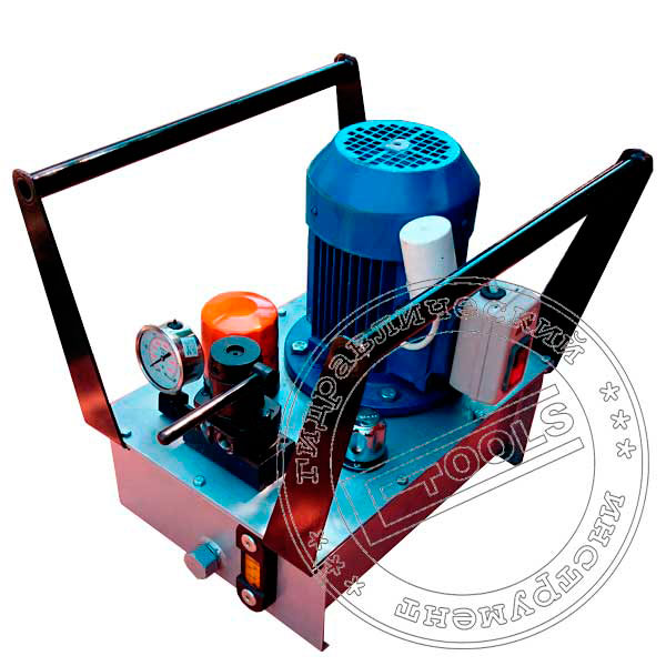 Насосная станция гидравлическая с электроприводом НЭП — мобильный упрощенный вариант маслостанции с минимально необходимой комплектацией, содержит следующие стандартные компоненты: двигатель, гидравлический бак, заливная горловина, фильтры на возврат и всасывание гидравлической жидкости, одноступенчатый плунжерный насос (на базе одной плунжерной пары), манометр, коллектор. Принцип действия гидравлической маслостанции состоит в том, что двигатель, закрепленный на корпусе механизма приводит в действие насос, который создает давление рабочей жидкости в гидравлической системе и обеспечивает перекачку из бака в исполнительные гидравлические модули с необходимыми гидравлическими параметрами. Оптимальные значения параметров подача и давление определяются производителем инструмента для каждой конкретной модели и указываются в технической документации. Мощностные характеристики электродвигателей устанавливаемых на насосные станции гидравлические типа НЭП зависят от рабочего давления и необходимой скорости подачи гидравлической жидкости, а так же рекомендаций производителей гидравлических насосов. На крышке масляного бака смонтирована монтажная плита с модулем предохранительного клапана настроенным на 70 атм и двухканальным коллектором с присоединительными резьбовыми отверстиями К3/8” для подключения внешних гидравлических исполнительных модулей. Сливной порт монтажной плиты посредством трубопровода соединен со сливным фильтром внутри бака. На верхней плоскости коллекторе смонтирован ручной трехпозиционный гидрораспределители для управления потоком рабочей жидкости в каналах коллектора. Манометр со шкалой до 1000 атм. в виброустойчивом исполнение обеспечивает контроль давления в гидросистеме. На крышке маслобака смонтирована заливная горловина-сапун для заполнения маслобака и связи с атмосферой. Контроль уровня масла в баке осуществляется указателем уровня масла смонтированым на торце маслобака.