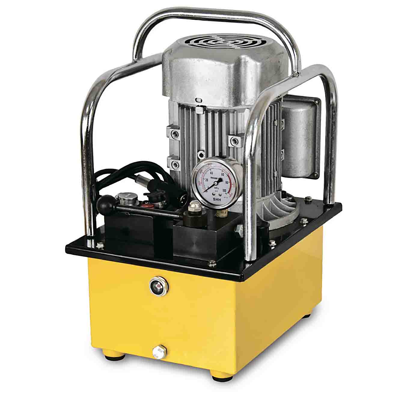 Станция насосная гидравлическая с электроприводом СНГ-6306Э одноканальная с электромагнитным клапаном управлением подачей / сбросом давления рабочей жидкости в гидравлических системах одностороннего действия. Гидравлический насос с электроприводом обеспечивает подача в две ступени гидравлической жидкости с высокой скоростью без нагрузки до 5.0 л/мин для прохождения холостого хода рабочего инструмента. Непосредственно рабочий цикл происходит при подаче 0.7 л/мин, что для основной массы электромонтажного гидравлического инструмента с рабочим объёмом не более 150 см3 является достаточным по скорости для выполнения операций по резке кабеля, опрессовке кабельных наконечников и пробивке отверстий в металле.