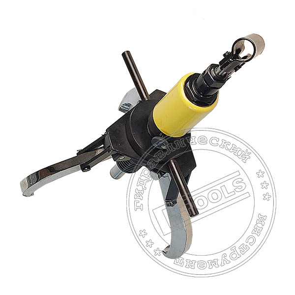 За счет вращения силовой гайки с проушинами для креплениями лап захватов по трапецеидальной резьбе силового цилиндра производится выбор необходимой глубины захвата в диапазоне заложенном конструктивом для конкретной модели, в данном случае равен 105 мм. Шарнирное соединение с помощью дистанционны элементов лап захватов с проушинами силовой гайкой, обеспечивает максимальное удобство и точность позиционирование съемника на обслуживаемом узле перед этапом непосредственного съема детали посаженной с натягом.