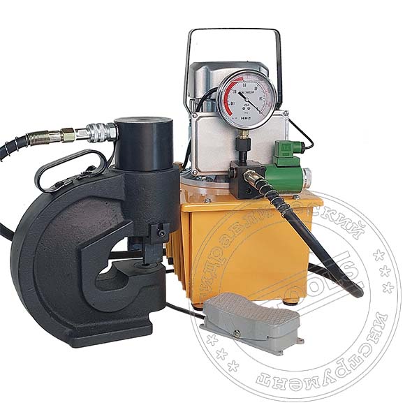 В качестве гидравлического привода комплекта для перфорации токоведущей шины СНГ + ШП-110/12+ используется гидравлическая насосная станция одинарного действия с электроприводом. Управление потоком, производится педалью электромагнитного гидрораспределителя рабочим давлением 700 кг/см2: :
