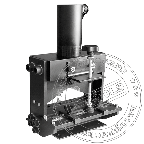 Шинорез гидравлический состоит из силового цилиндра с пружинным возвратом и траверсы с вертикальными пластинами обеспечивающими центровку и направление подвижного ножа. Широкий приемный стол с двумя системами прижимов вертикальной и горизонтальной, а так же линейкой обеспечивает необходимую точность позиционирования линии реза токоведущей шины. Подвижный V-образный нож закреплен на штоке силового цилиндра приводится в действием за счет подачи гидравлической жидкости в рабочую полость цилиндра. Возврат в исходное положение происходит при открытии крана сброса давления на внешнем гидравлическом насосе под действием возвратной пружины силового цилиндра. Подключение внешнего гидравлического насоса или маслостанции производится с помощью системы быстроразъемов через рукав высокого давления. Благодаря модульному исполнению обеспечена работа как в цеховых условия с размещением на верстаках необходимой конфигурации, так и в полевых условиях прямо на объекте у заказчика.Конструктивные особенности гидравлического шинореза