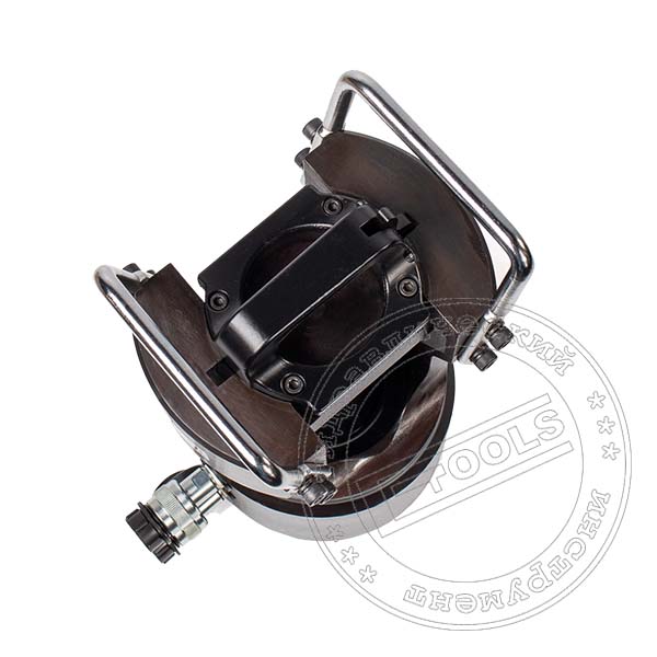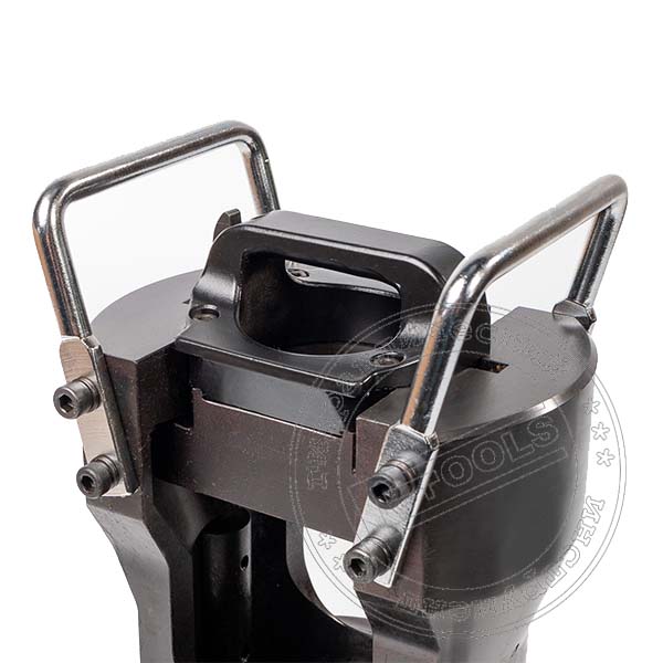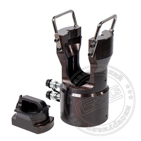 Сменные матрицы устанавливаются в рабочую головку с жесткой фиксацией и защитой от проворота с предварительным излечением поворотной крышки-затвора. Поворотная крышка-затвор обеспечивает удобство помещения прессуемых аппаратных зажимов или гильз в зону опрессовки. Обеспечивает разблокировку аппаратного зажима в любой в момент процесса опрессовки. Верхняя полуматрица в процессе работы упирается в поворотную крышку. Нижняя подвижная полуматрица, в процессе работы перемещается штоком рабочего гидроцилиндра усилием 100 тонн.