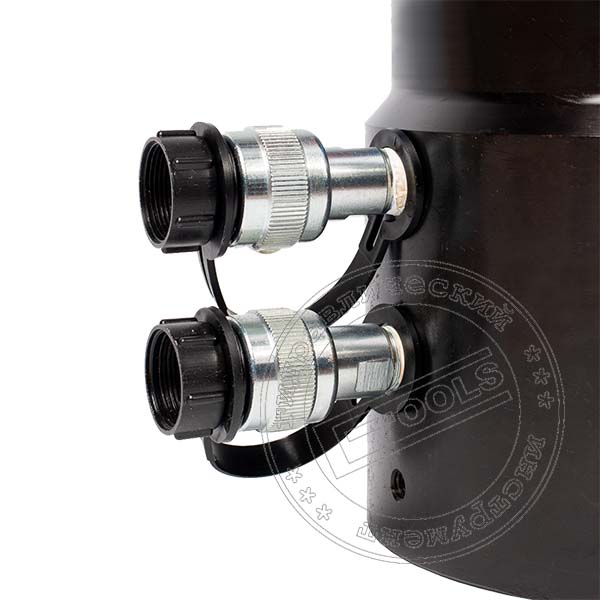 Подключение пресса гидравлического двухстороннего действия с усилием 100 тонн к внешнему насосу производится через два быстроразъемных соединений (БРС), полумуфты которого позволяющих быстро и без потерь масла подсоединять или отсоединять рукава высокого давления необходимой длины к гидравлической системе пресса.
